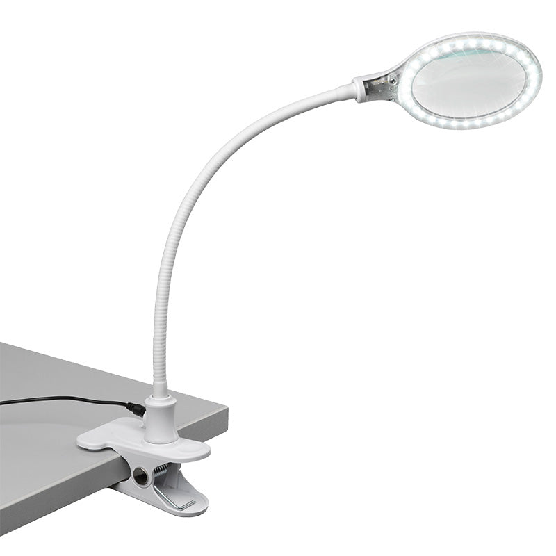 Förstoringslampa med klämma. Lampan använder 36 SMD LED lysdioder som är mycket robusta och har en lång livslängd. Eftersom de inte har någon lins, är ljusvinkeln mycket bredare än vanligt.